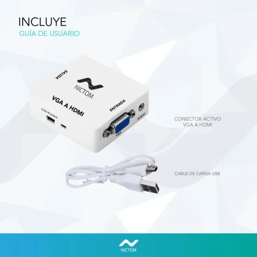 Este dispositivo permite convertir una señal de un puerto VGA para visualizarla en un televisor con entrada HDMI. Es compatible con múltiples dispositivos que cuentan con salida VGA, como PCs de escritorio y notebooks. El conversor se alimenta mediante un puerto USB y se incluye el cable necesario. En caso de no disponer de un puerto USB cercano, se puede utilizar un cargador de pared USB para su alimentación. Cabe destacar que el conversor transmite tanto audio como video. Es importante mencionar que no es compatible con la conversión de señales HDMI a VGA.