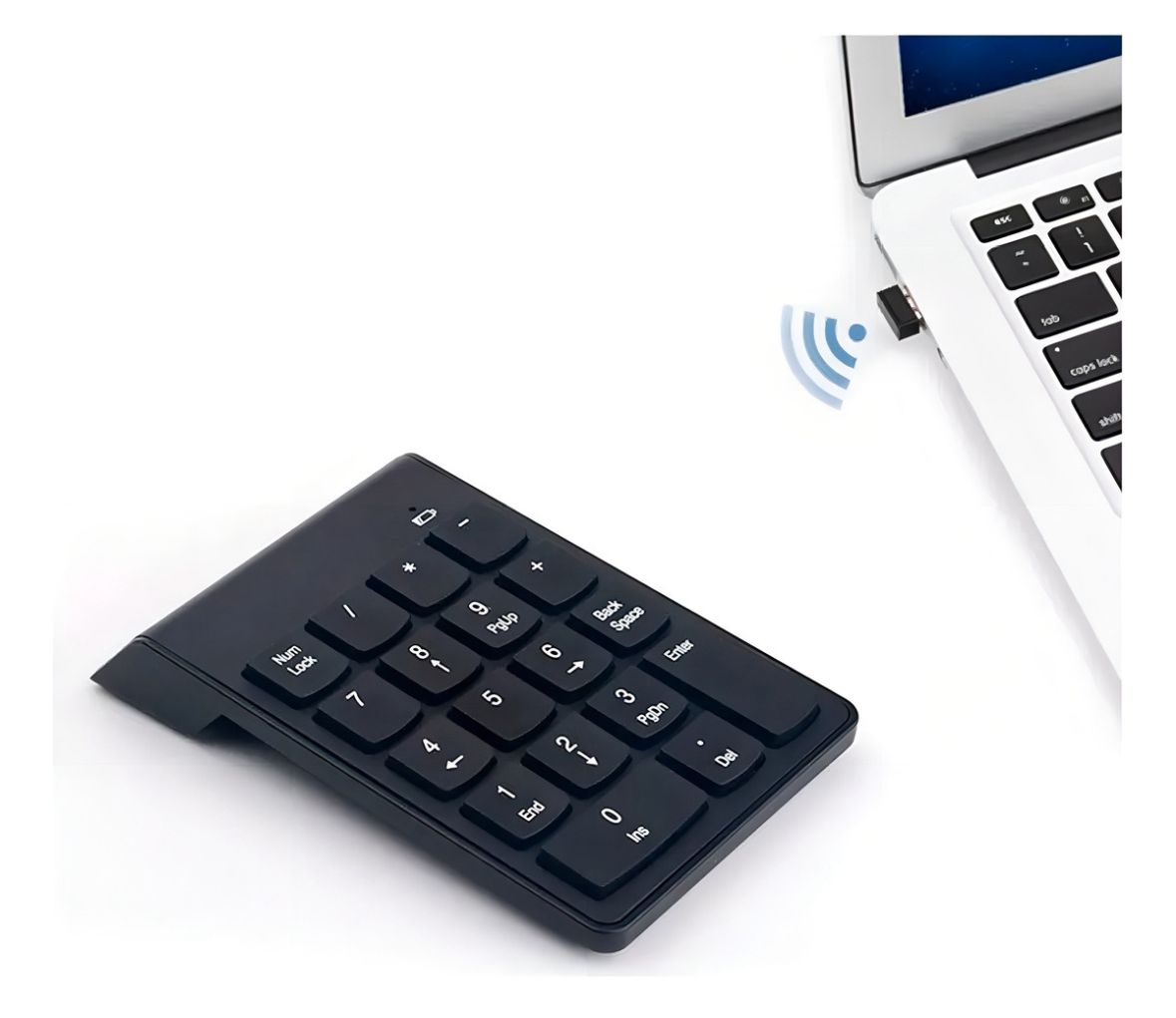 Teclado numérico compacto, inalámbrico, ideal para quienes usan mucho números: contabilidad, facturación, escritorios portátiles o cuando el teclado del laptop no tiene numpad.