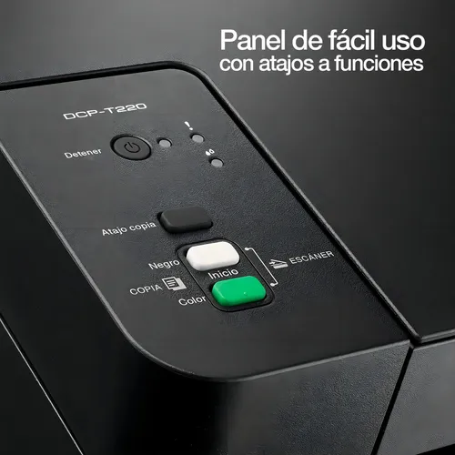 La Brother DCP-T220 es una impresora multifuncional ideal para el hogar o la oficina en casa. Ofrece impresión rápida (hasta 28 ppm en negro y 11 ppm a color), con una resolución de hasta 6,000 x 1,200 dpi para alta calidad en documentos y fotos. Viene con una bandeja para 150 hojas y una ranura manual para varios tamaños de papel. Su tanque de tinta de recarga frontal facilita su mantenimiento y cuenta con un cable USB para conexión a PC. Además, incluye botellas de tinta de alto rendimiento.