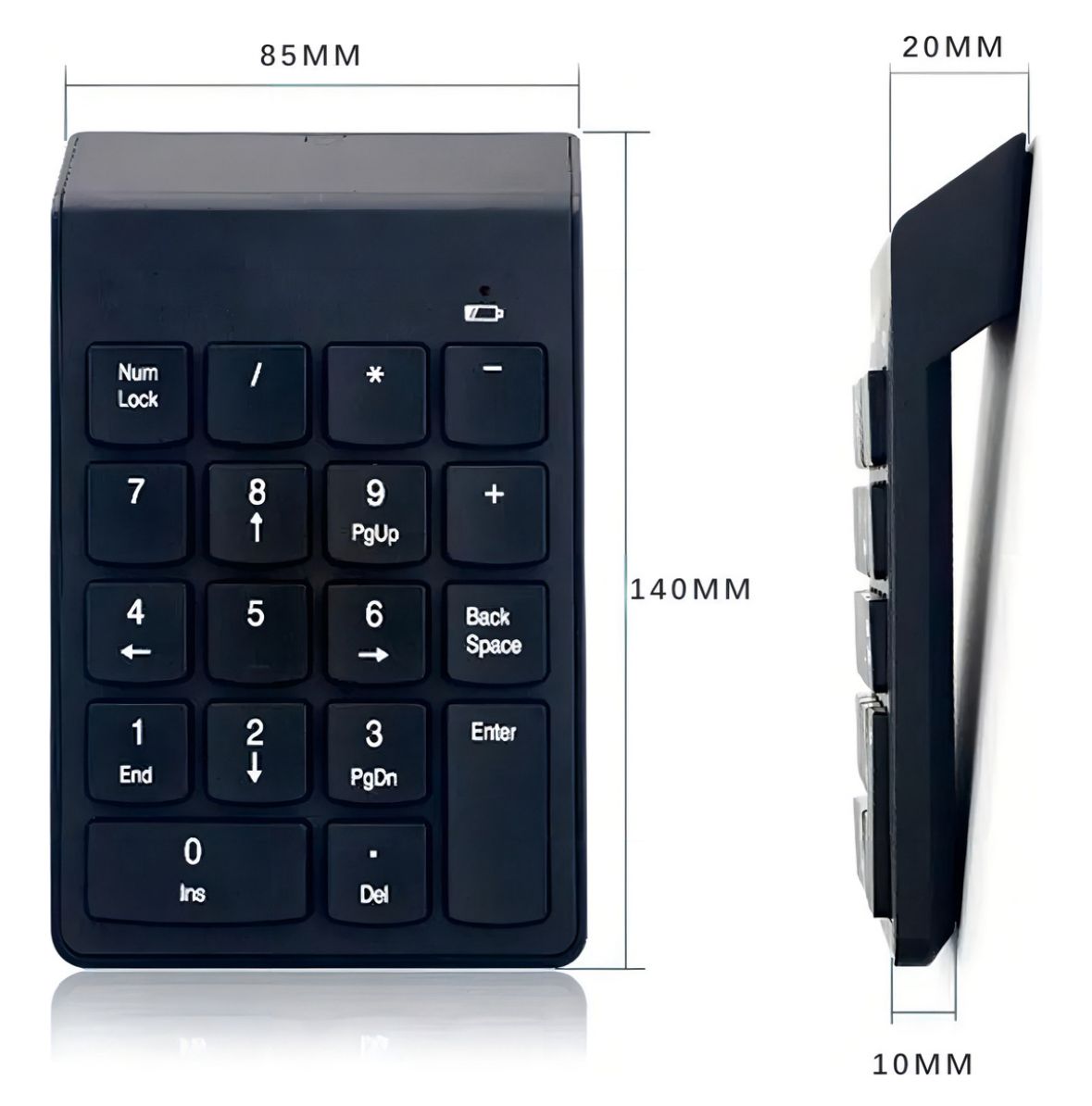 Teclado numérico compacto, inalámbrico, ideal para quienes usan mucho números: contabilidad, facturación, escritorios portátiles o cuando el teclado del laptop no tiene numpad.